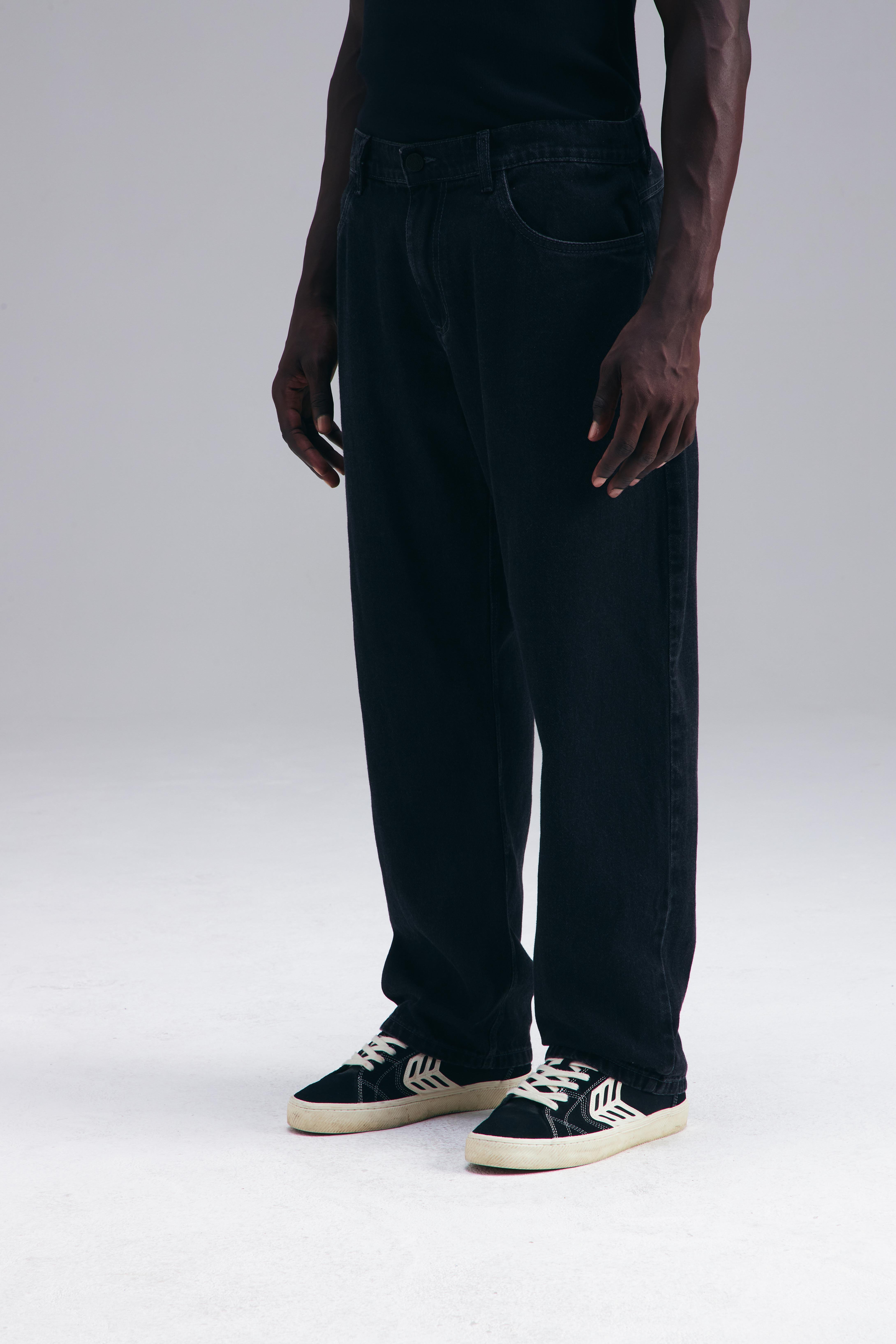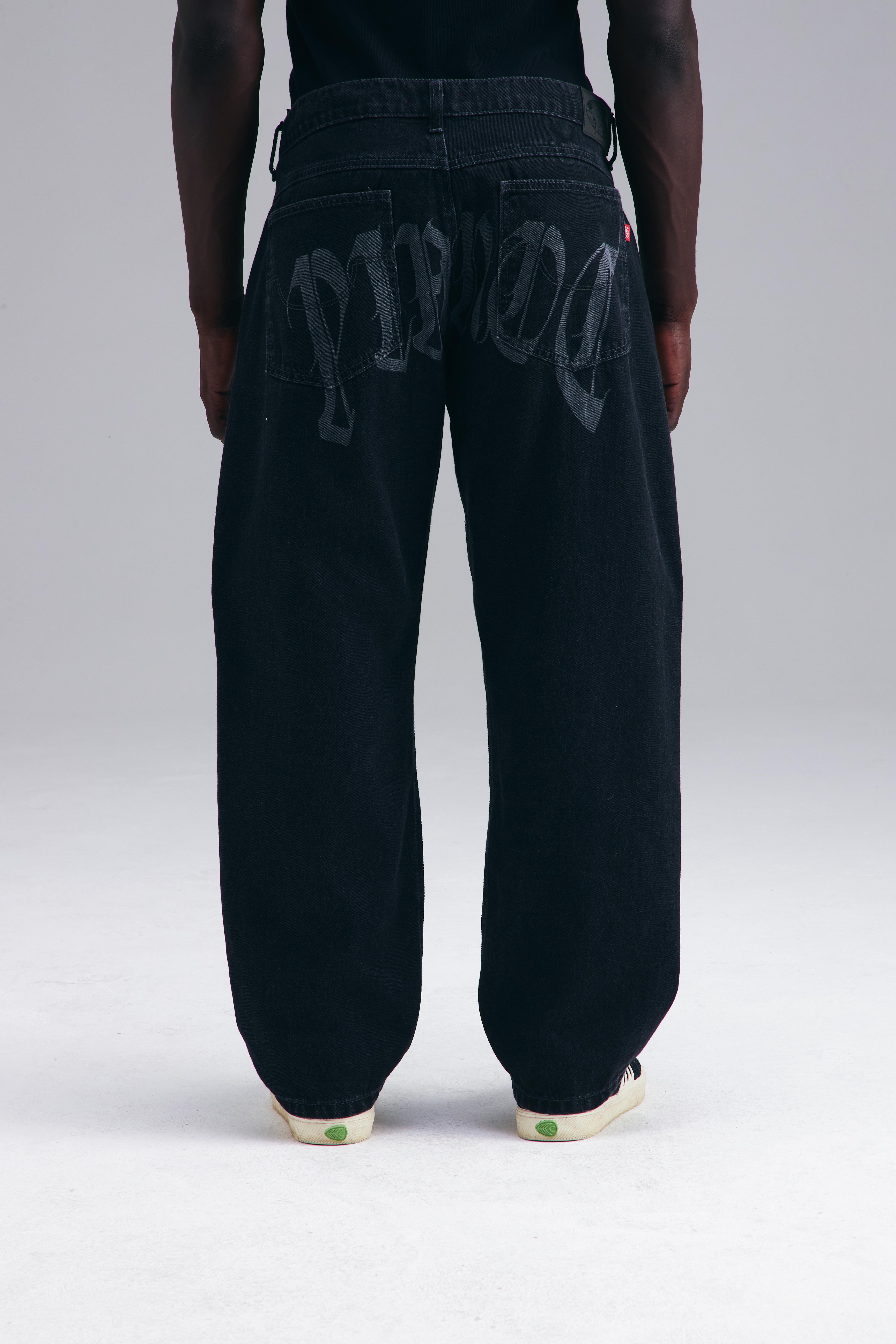 Confeccionado em jeans 100% algodão, com lavagem preta e efeito desgastado, trazendo visual desgastado. Modelagem reta de caimento solto, bolsas laterais estilo cargo e bolsas importadas com bordado personalizado. Destaque para as filigranas personalizadas nos bolsos traseiros e o patch de couro aplicado na parte de trás do cós. Cós tradicional com passantes, fechamento por botão e zíper.